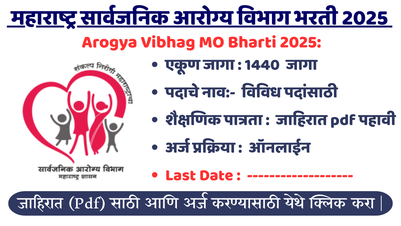 Arogya Vibhag MO Bharti 2025: महाराष्ट्र सार्वजनिक आरोग्य विभागामध्ये मोठी पद भरती होत आहे. एकूण 1440 पदांसाठी ही भरती होणार असून MO या पदांसाठी ही भरती असणार आहे. या भरतीसाठी ऑनलाईन पद्धतीने अर्ज केले जाणार असून अर्ज करण्याची शेवटची तारीख लवकरच कळवण्यात येईल.