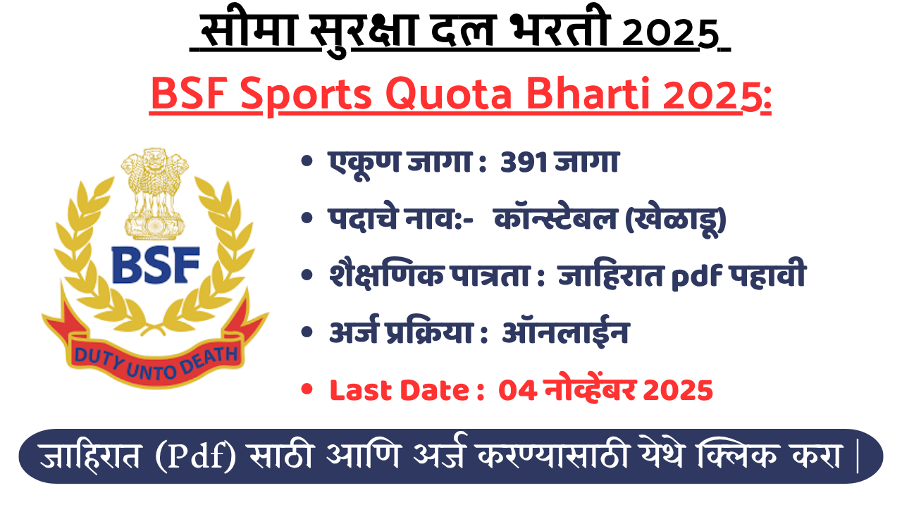 BSF Sports Quota Bharti 2025: सीमा सुरक्षा दलांतर्गत भरती करण्यात येत आहे. या भरती अंतर्गत तब्बल 391 जागांसाठी ही भरती होणार आहे. अनेक लोक सैन्यदला मध्ये भरती होण्याचे स्वप्न पाहतात. त्यांच्यासाठी ही मोठी संधी आहे.
