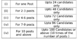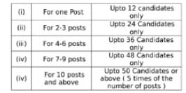 - त्यानंतर लेव्हल-1 वर तांत्रिक तपासणी करून, जर क्र. वरीलपैकी कोणत्याही पद्धतीनुसार अंतिम वैयक्तिक मुलाखतीसाठी निवडलेल्या उमेदवारांची संख्या मोठी आहे, त्यानंतर पुढील निवड यादी स्तर-2 वर तांत्रिक तपासणी करून म्हणजेच अल्प कालावधीची प्राथमिक ऑनलाइन मुलाखत (10-15 मिनिटे) आयोजित केली जाऊ शकते. प्राथमिक ऑनलाइन मुलाखतीसाठी निवडलेल्या उमेदवारांची संख्या खालीलप्रमाणे आहे (त्यांच्या उपलब्धतेच्या अधीन):