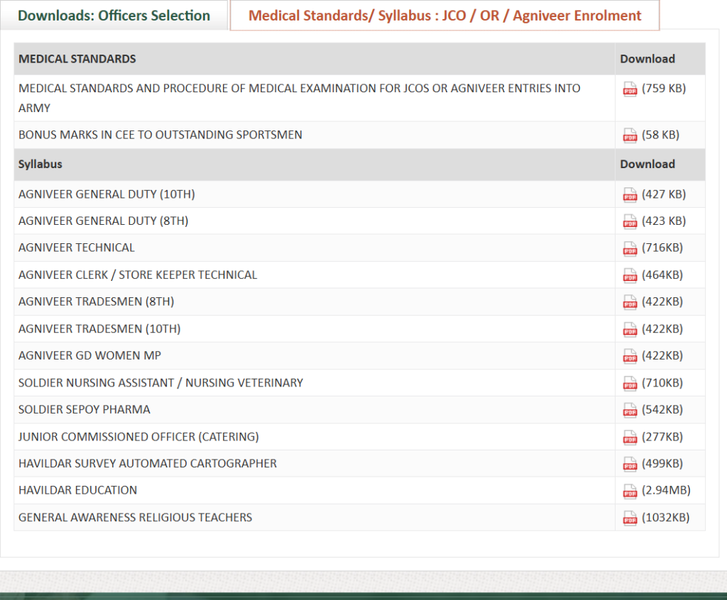 - त्यानंतर आपण Medical Standard/Syllabus : JCO/ QR / Agniveer Enrolment वर क्लिक करा आपल्या समोर वरील सार्व पदांचा अभ्यासक्रम येईल. आपल्याला हवा त्या पदाचा अभ्यासक्रम आपण डाउनलोड करू शकतो व आपण अभ्यासक्रम चांगल्या पद्धतीने वाचून अभ्यासाचे नियोजन करावे!